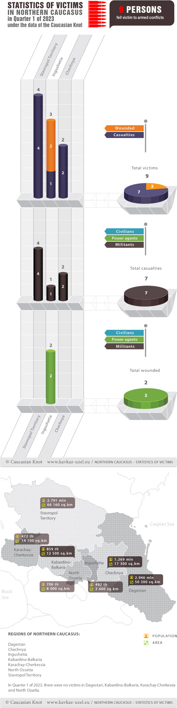 Infographics. Statistics of victims in Northern Caucasus in Quarter 1 of 2023 under the data of the Caucasian Knot