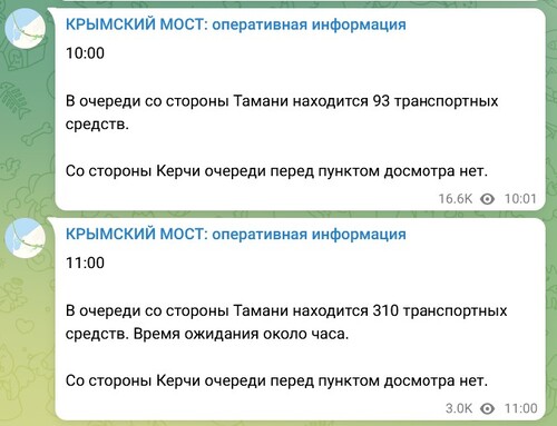 "The waiting time is about an hour. There is no queue in front of the inspection point from the Kerch side," the report says. According to hourly publications, there were no queues in front of the bridge until 9 Moscow time. At 9 Moscow time, there were 70 cars in line from the Taman side, and at 10 Moscow time, there were 93.
