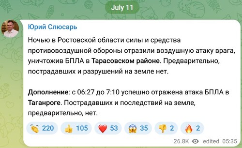 In turn, Yuri Slyusar at 07.35 Moscow time supplemented his publication, reporting that "from 06:27 to 07:10, a UAV attack was successfully repelled in Taganrog."