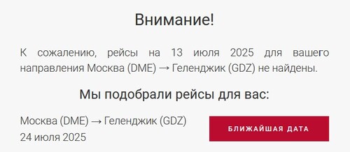 According to data on the Ural Airlines website, the next flight U6-115 from Moscow to Gelendzhik is scheduled for 13.20 Moscow time on July 24. The cost of a ticket, depending on the class, varies from 19,259 rubles to 45,254 rubles.