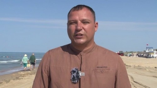 The publication is illustrated with a video version of Nikolai Zalivin's report. Behind him special equipment working on the sandy beach and groups of vacationers, including with children, are visible on the shore and in the water.