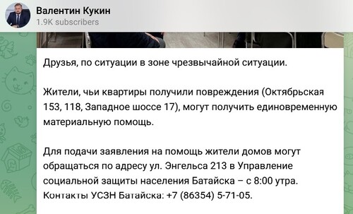 Bataysk Mayor Valentin Kukin published an address to residents today on his Telegram channel. "Friends, regarding the situation in the emergency zone. Residents whose apartments were damaged (Oktyabrskaya 153, 118, Zapadnoye Shosse 17) can receive one-time financial assistance," he wrote.