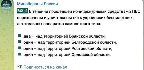 According to the department's publication, the remaining drones were shot down outside the North Caucasus and Southern Federal Districts: in the Bryansk, Belgorod, and Oryol regions.