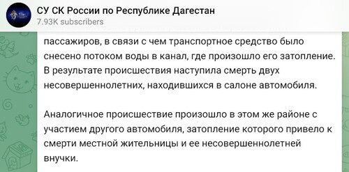 As a reminder, on April 5, the Gejukh dam collapsed in Dagestan, washing several cars off the highway. Rescuers pulled seven people from the water, two of whom died in the hospital. Two more people are missing. The body of a five-year-old girl was later found, and rescuers continued the search for her grandmother.