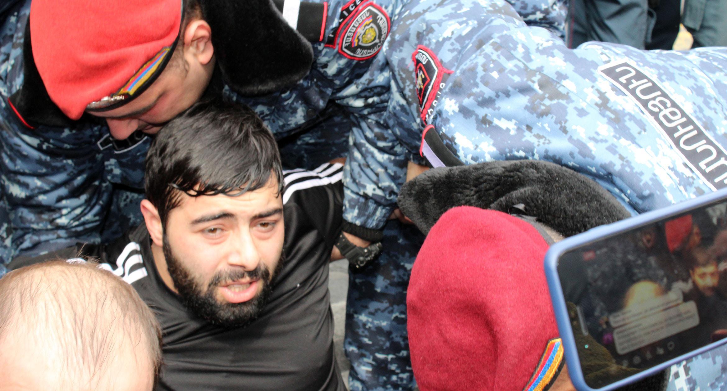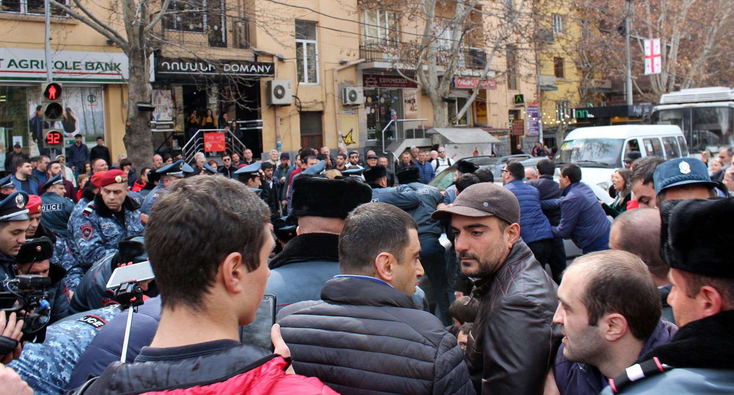 The protest by owners and staff of the cafés was triggered by the decision of Yerevan authorities to demolish several cafés in Freedom Square. The city authorities insist that the territory around the Academic Opera and Ballet Theatre was built up voluntarily; and the surroundings should be returned to their historical appearance. In their turn, protesters assert that the café demolition will make over 200 people jobless. On March 14, participants of the spontaneous rally blocked Mashtots Avenue in protest. The police managed to push the protesters away from the roadway to the sidewalk and restore the traffic. During the skirmishes of protesters with the police, four people were injured. 41 participants of the action were detained, 25 of them were released by the police by the end of the day. Photos by the Caucasian Knot correspondent Tigran Petrosyan.
